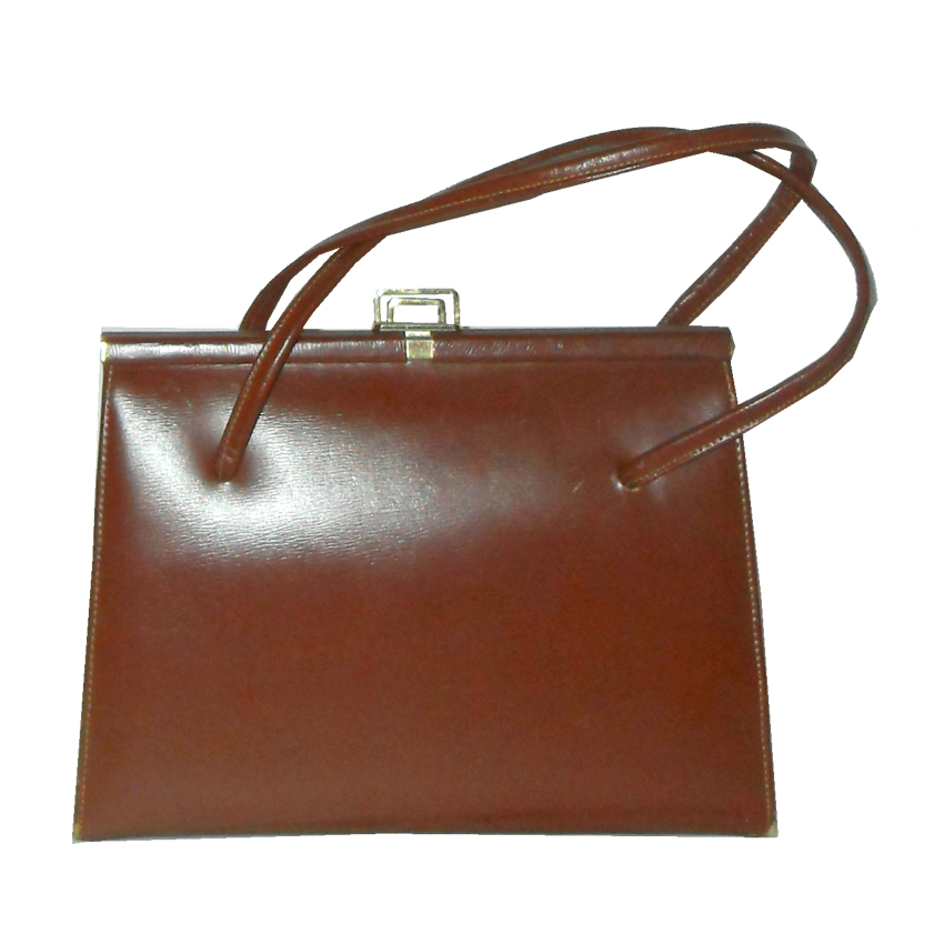 Brown leather Elbief frame handbag lined in suede with one zip pocket inside. Measures 10″ (25cm) x 7.5″ (19cm) without handle. There is a biro mark to the lining and some wear to the leather on the sides and corners.