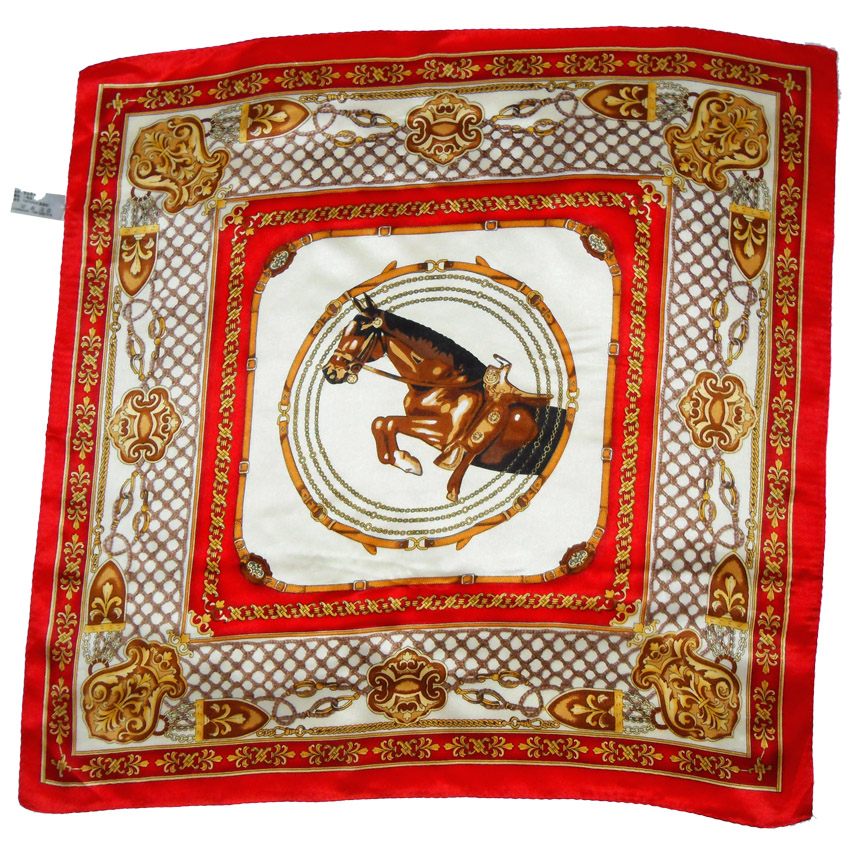 B&Balos horse design silk satin square with a red border and which measures 20.5″ (52cm) x 20.5″ (52cm).