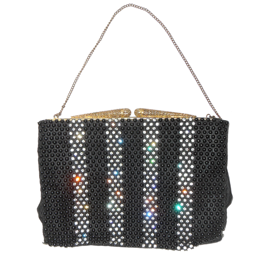 Vintage black bead and crystal diamanté framed evening bag with gold tone frame, an intricate cone shaped clasp and a gold tone chain handle. This bag is lined in black satin and has a small pocket inside with a smaller pocket for lipstick edged in gold. Measures 7.5″ (19cm) x 5.5″ (14cm).