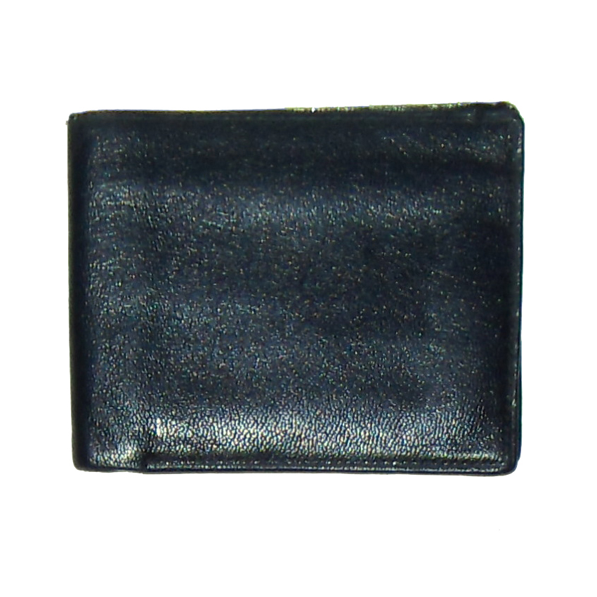 Black leather bifold wallet with pockets for notes and cards.  Measures 4.5″ (11cm) x 3.5″ (9cm).