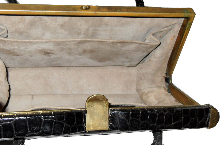 Black croc framed handbag with a suede lining and three pockets inside. Measures 8.5″ (21.5cm) x 5.5″ (14cm).  Some tarnish to the gold tone metal clasp and slight wear to the base of the bag.