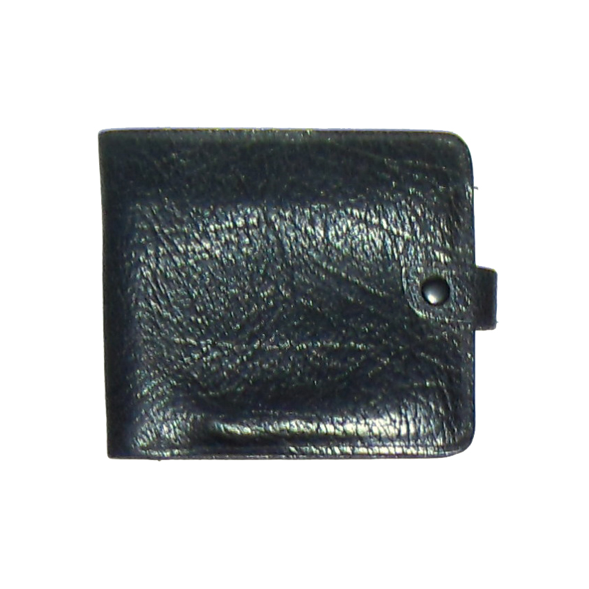 Black grained leather bifold wallet, made in England, with pockets for notes, cards, driving licence and stamps. Measures 4.5″ (12cm)  x 4″ (11cm).