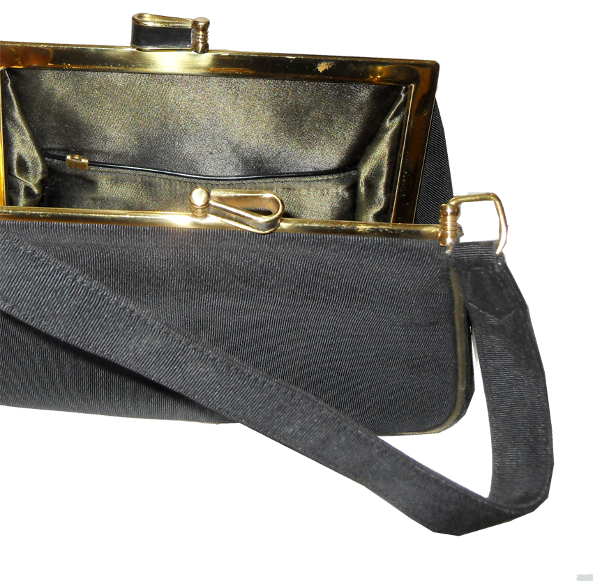 Small black grosgrain fabric handbag with a black and gold tone clasp closure and two small pockets inside. Measures 8.5″ (22cm) x 5.5″ (14cm) without handle.
