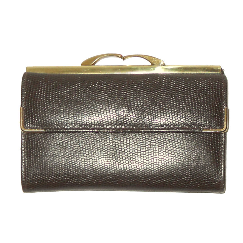 Dark brown grained calf leather purse with gold tone frame and clasp which has pockets for notes and a coin section.  Measures 5.5″ (14cm ) x 3.5″ (9cm).