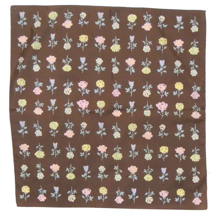 Silk square with a brown background and a design of flowers in pink and yellow. Measures 16.5″ (42cm) x 17″ (43cm).