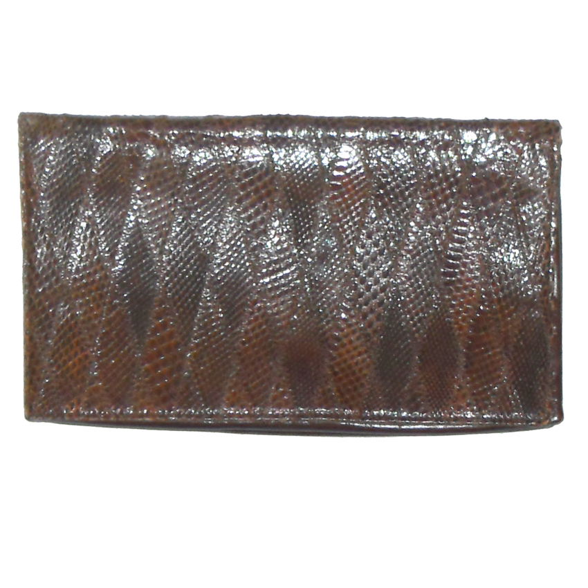 Retro brown snakeskin and brown leather clutch bag which is lined in grosgrain fabric and has one zip pocket inside. Measures 11″ (28cm) x 6.25″ (16cm). Some slight wear.