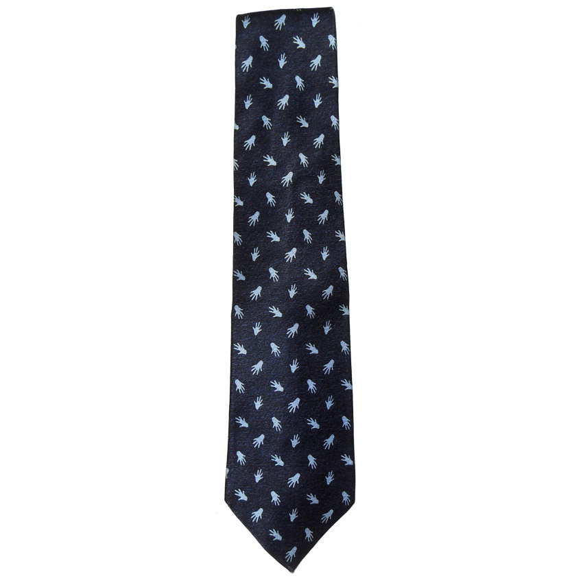 Bulgari Davide Pizzigoni silk tie with a dark blue background and a design of hands in light blue