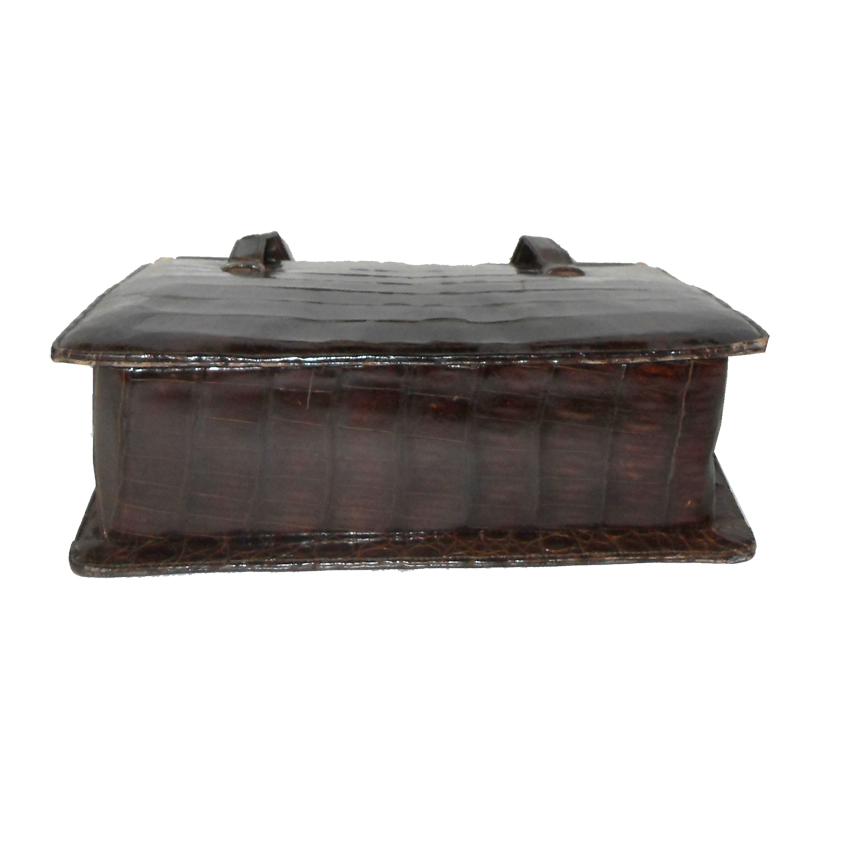 Caiman crocodile handbag made in Argentina which is lined in suede and has several small pockets and a zip pocket inside. Measures 11″ (28cm) x 8″ (20cm) without handles.