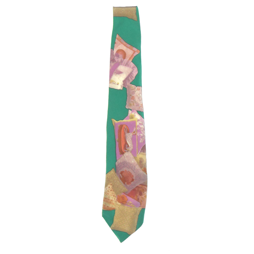 Bright green silk background tie with a design of cushions in mauves and golds, one with a dog and others with flowers and checks.