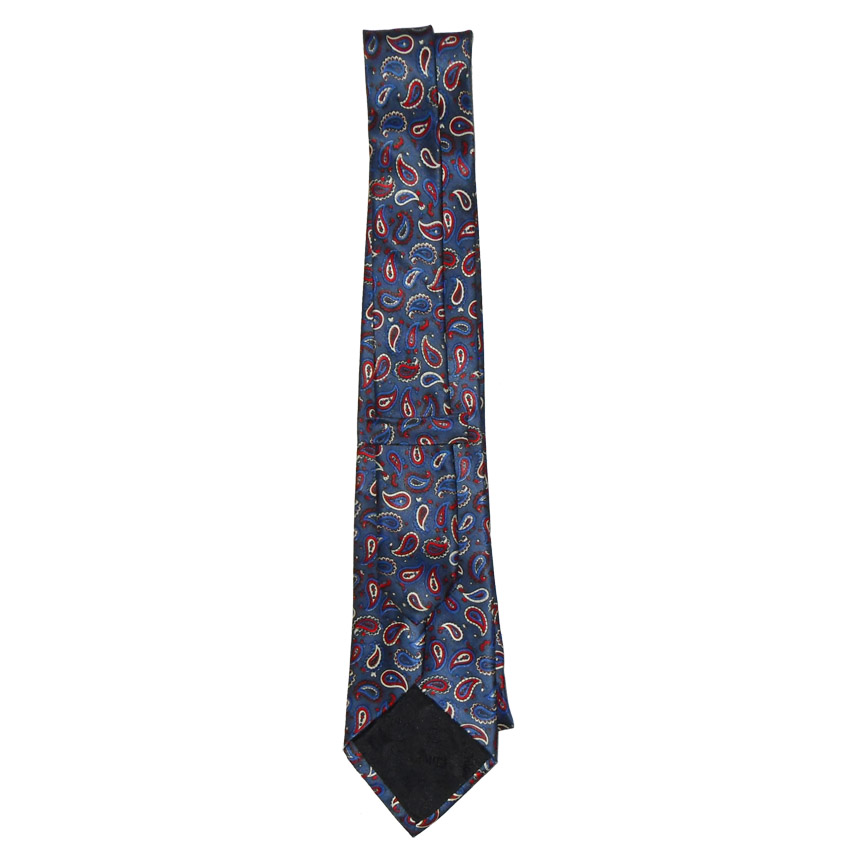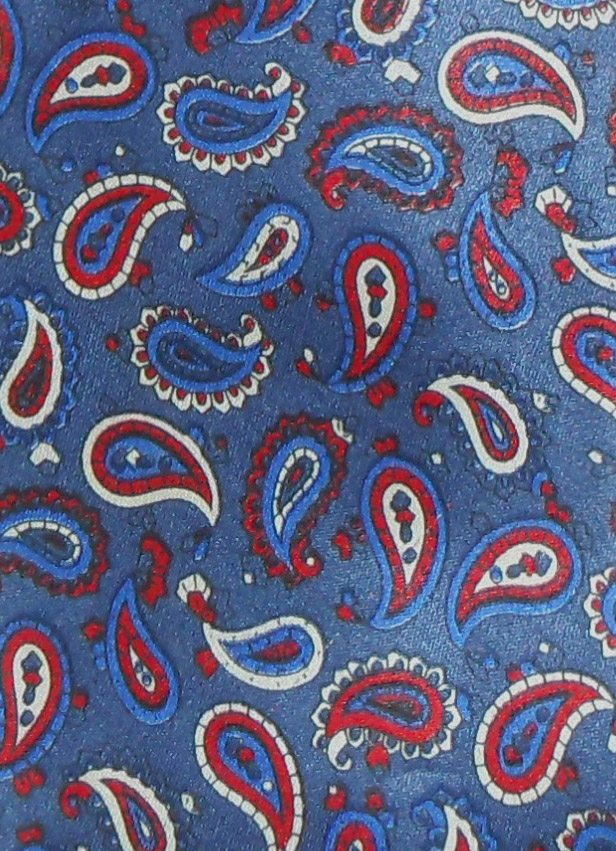 Chloe silk satin tie with a blue background and a red, white and blue paisley design.
