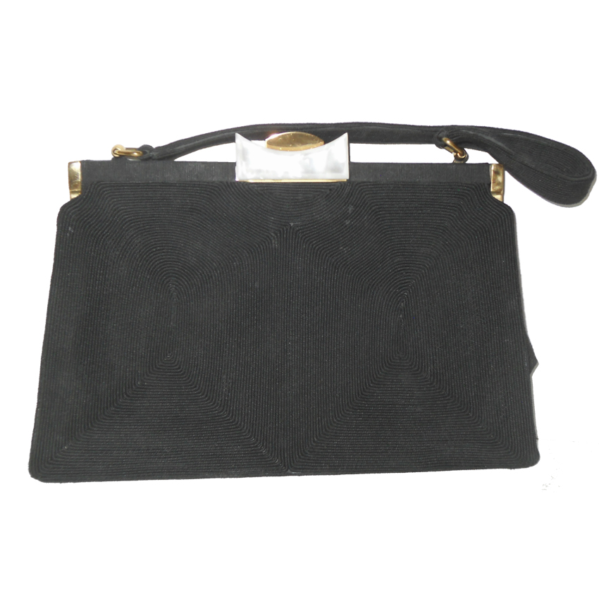 Vintage black Cordé handbag with gold tone fittings and a black satin lining. Measures 11″ (28cm) x 7″ (18cm) without the handle. There are some marks to the front and base of the bag and the lining.