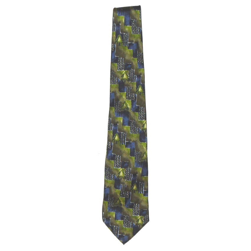 Vintage Courreges silk tie in shades of green and dark blue with a fir tree design.