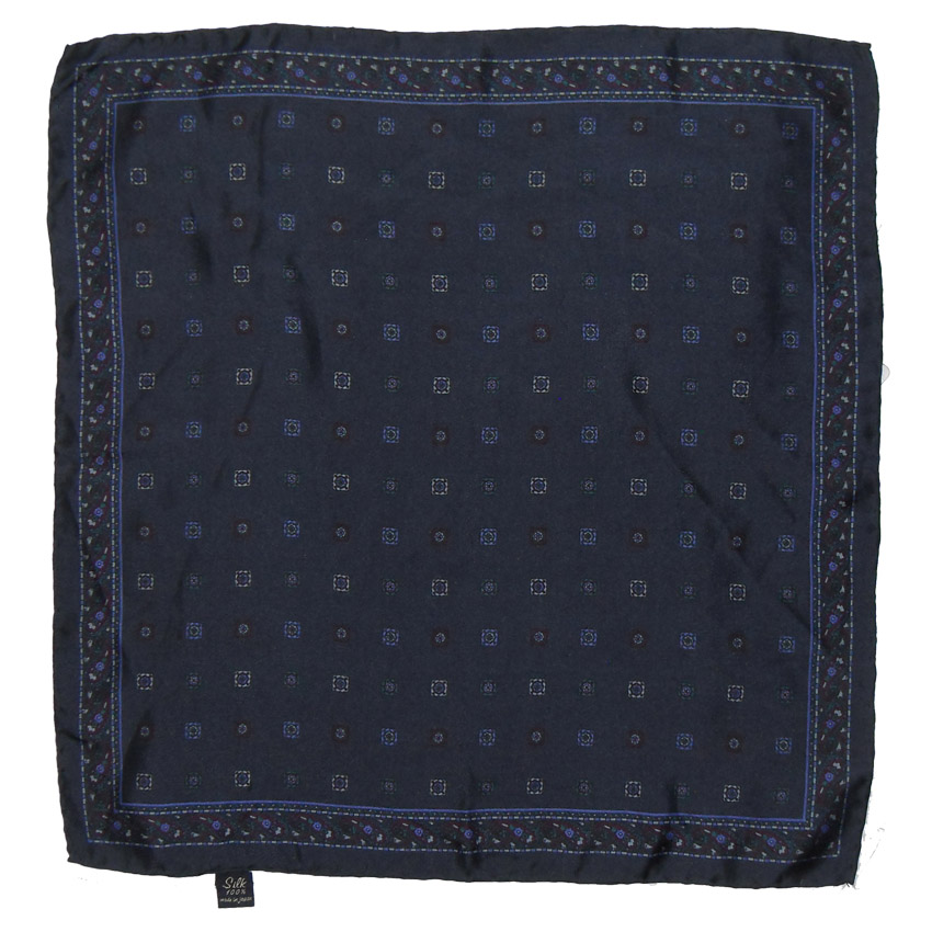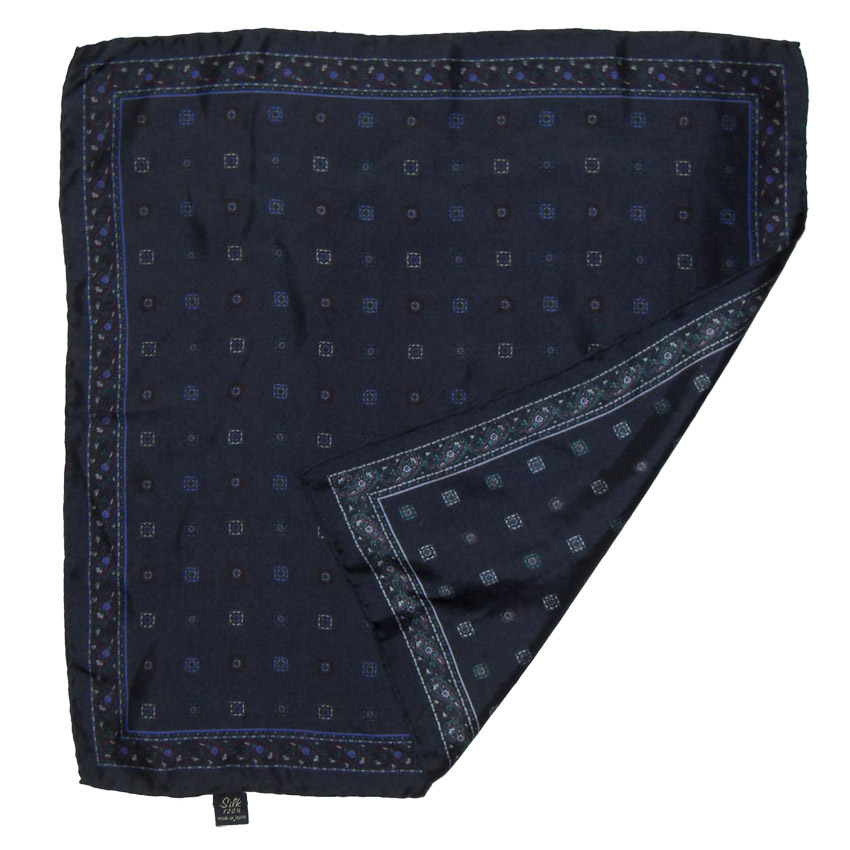 Hard rolled edge dark blue silk square with a paisley design border. Hand made in Japan. Measures 16″ (41cm) x 16″ (41cm).