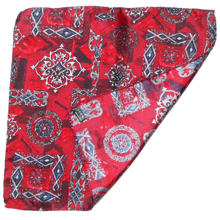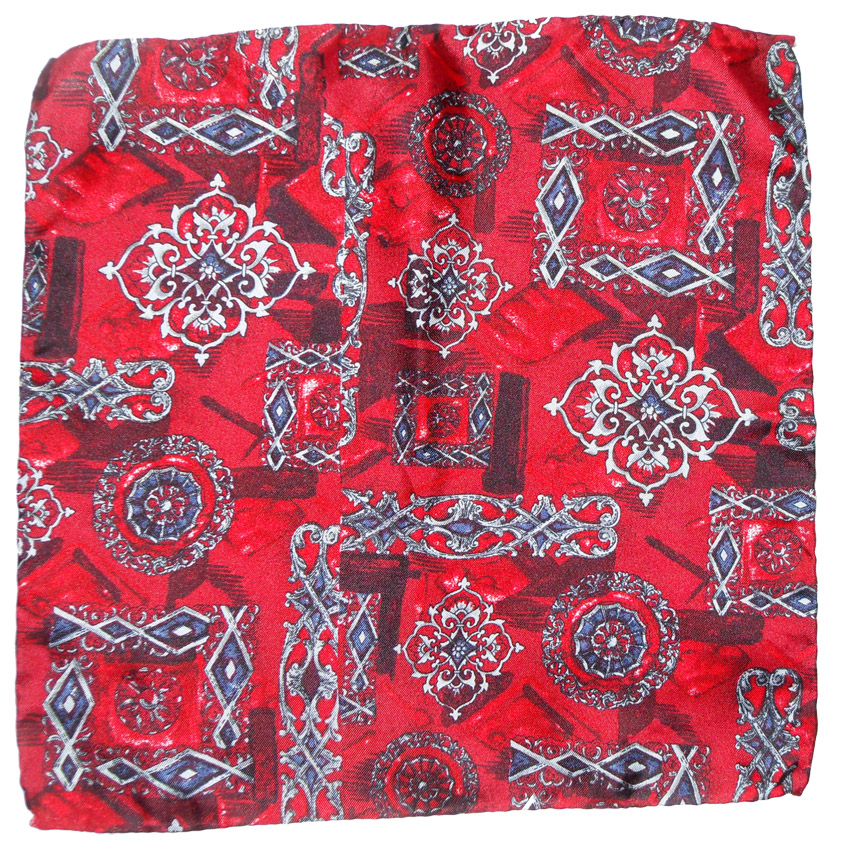 Silk pocket square with a dark red background and a blue and silver design, made in Italy. Measures 11″ (28cm) x 11″ (28cm).