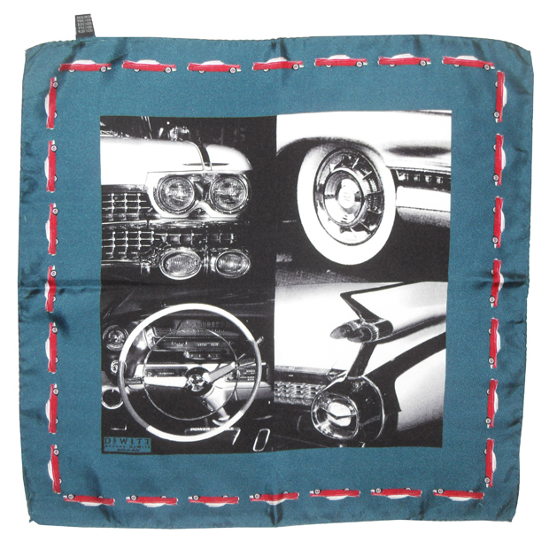 Hand rolled edge silk pocket square with a dark green border with a design of a red American vintage car and a central design of parts of the car in black and white.