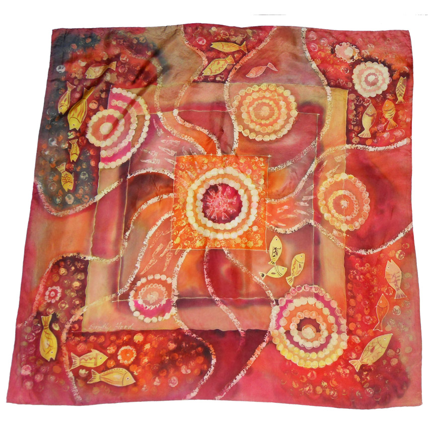 Abstract fish design silk scarf in warm orange and copper tones,signed by the artist, Dorothy Hood.  Measures 33″ (84cm) x 34″ (86cm).