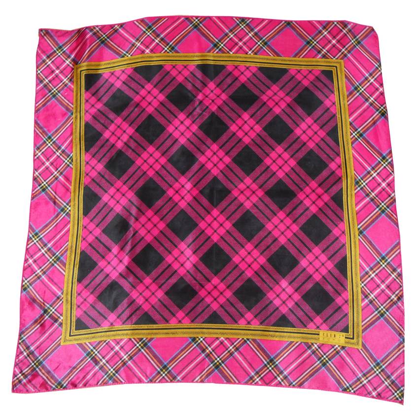 Club 7 Echo silk scarf with a pink plaid design. Measures 32″ (81cm) x 31″ (78cm). Some slight thinning of the silk.