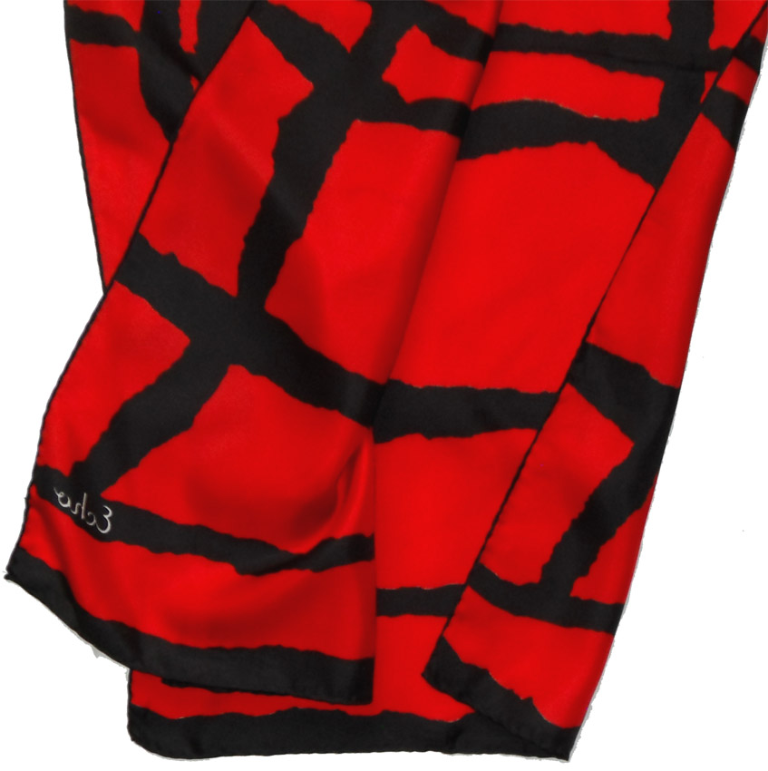 Echo long silk scarf with hand rolled edges and a red and black design. Measures 66″ (168cm) x 15″ (38cm)