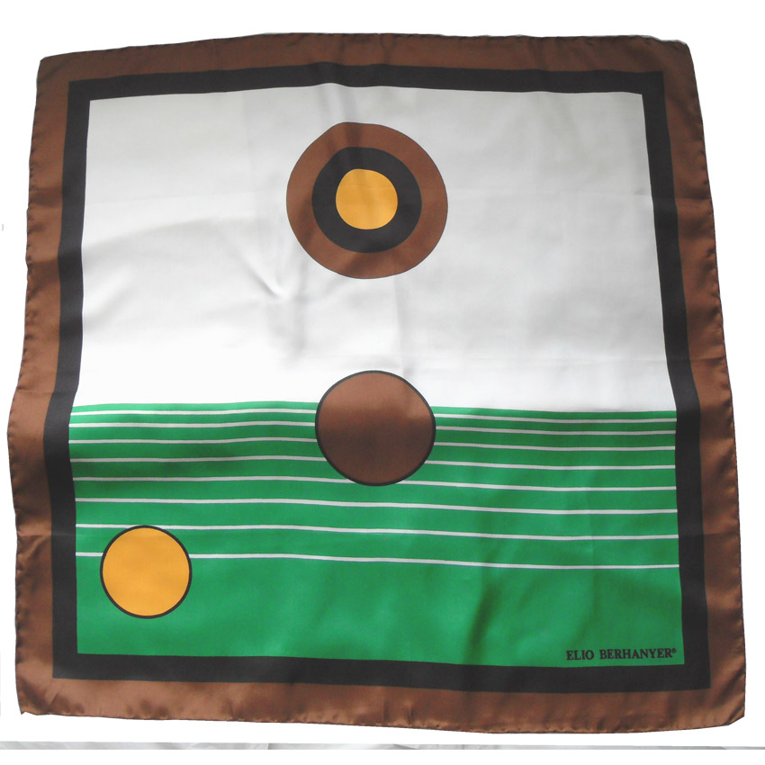 Vintage Elio Berhanyer silk scarf with hand rolled edges, a brown border and a vibrant circle design. Measures 29″ (74cm) x 29″ (74cm).