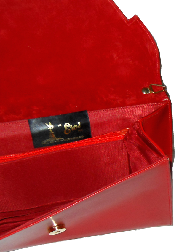 VintageĀ Eros, made in England, red leather handbag with front flap closure, a detachable red leather shoulder strap for conversion to a clutch and a red suede lining on the inside of the front flap and red grosgrain lining in the rest of bag. There is one zip pocket and a couple of other pockets inside. Measures 10.25″ (26cm) across x 7″ (18cm) high when closed