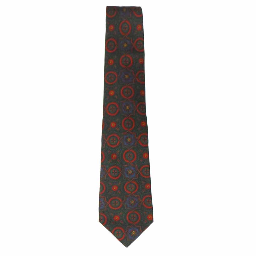 Etro, Italy silk tie with a dark green background and a blue and red design with circle and star shapes.