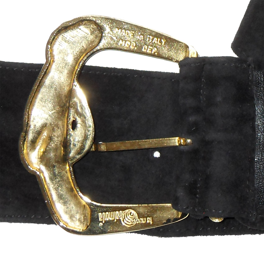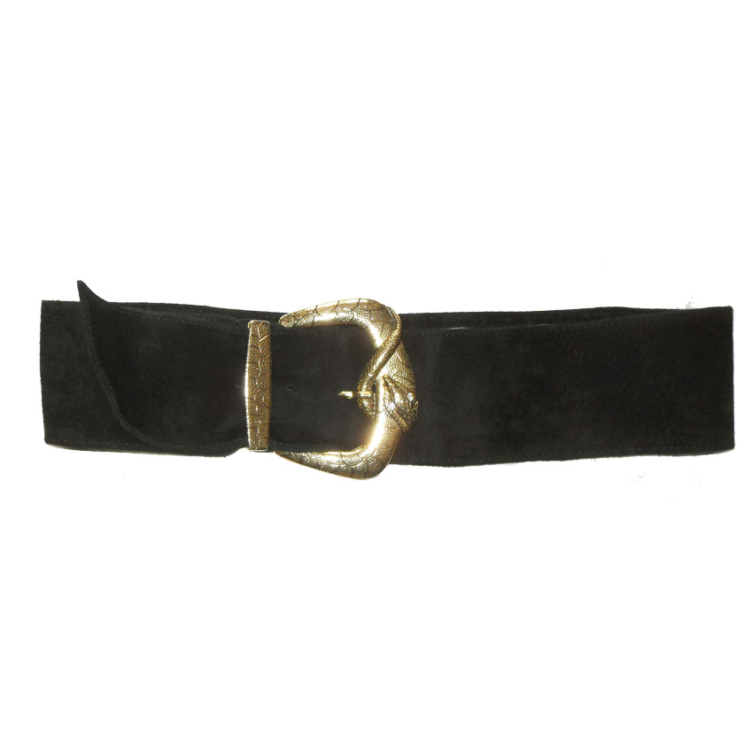 Fashion Ways black suede belt with la gold tone metal buckle in a snake design with clear diamanté eyes. Measures 3″ (8cm) wide x 34″ (87cm) end to end without buckle. Size L.
