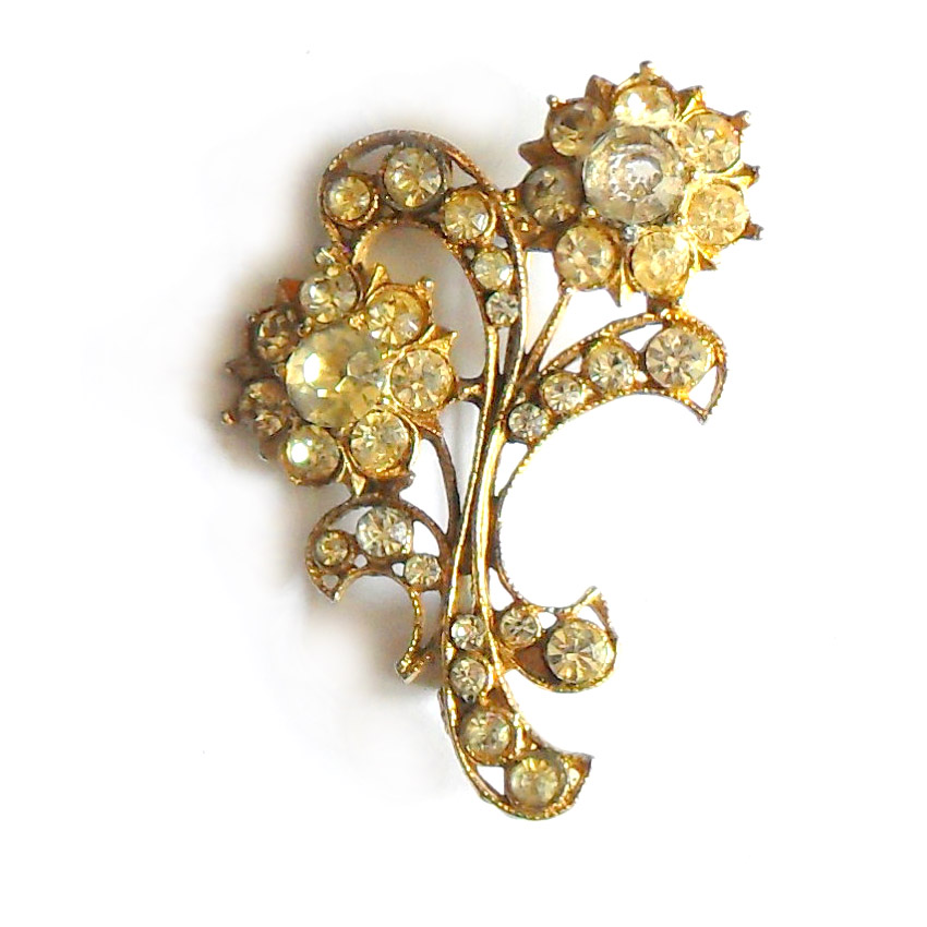 Gold tone metal flower design brooch set with clear stones. Measures 2.25″ (5.5cm) high.