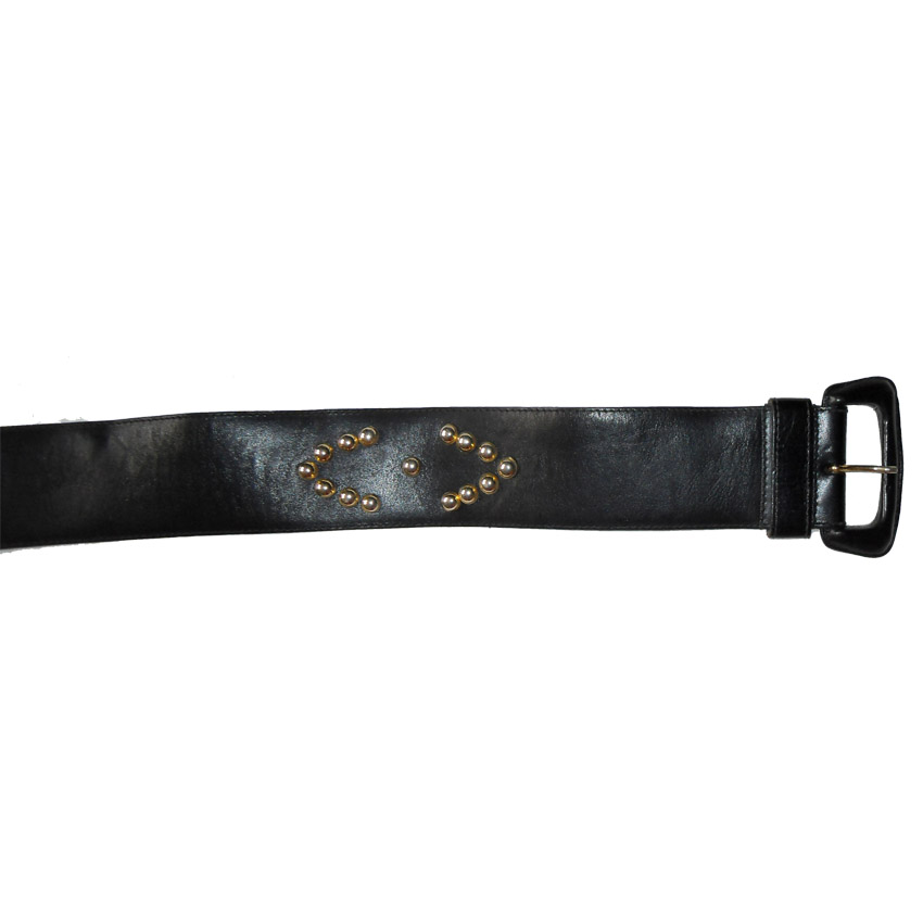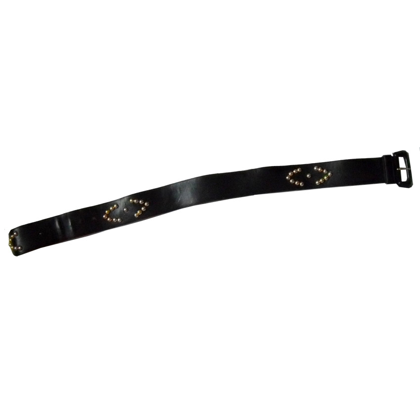 er belt with gold tone studs. Size 32. Measures 2.25″ (6cm) wide x 34″ (86cm) end to end without buckle. Some wear.