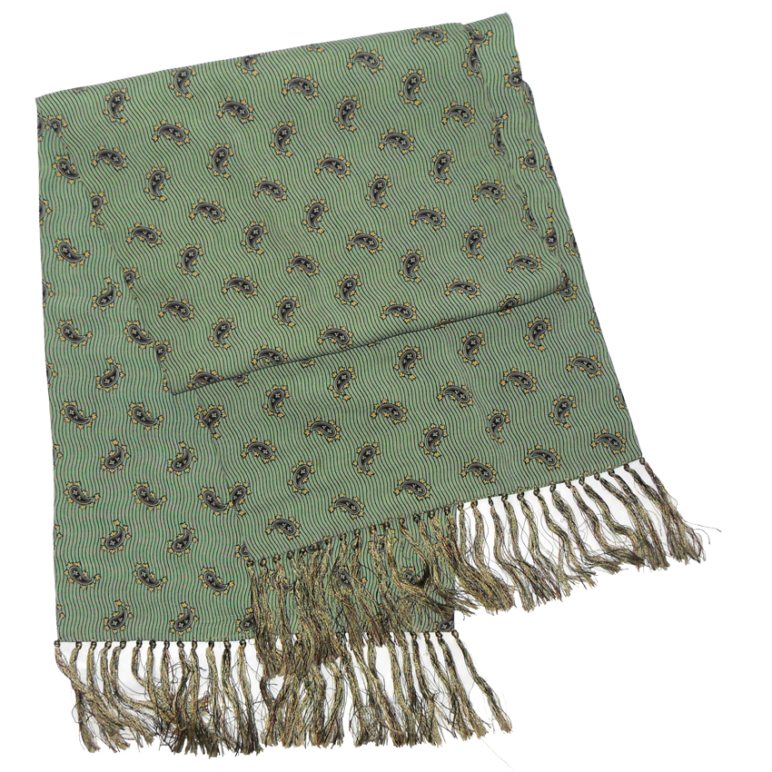 Rayon paisley design scarf on a green lined background with hand tied tasseled ends. Measures 46″ (117cm) long without tassels by 11″ (28cm) wide.