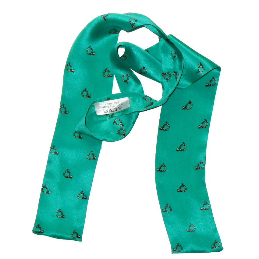 Emerald green silk narrow width cravat with a design of a French horn. Made in Japan.
