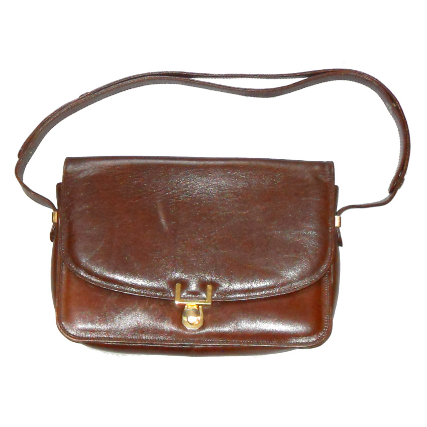 Harvey Nichols, Knightsbridge, made in Italy, brown leather bag with an adjustable strap and gold tone metal closure. There is a small zip closure pocket inside and three separate sections. Measures 10″ (26cm) across x 7.5″ (19cm) without strap. Some light wear.