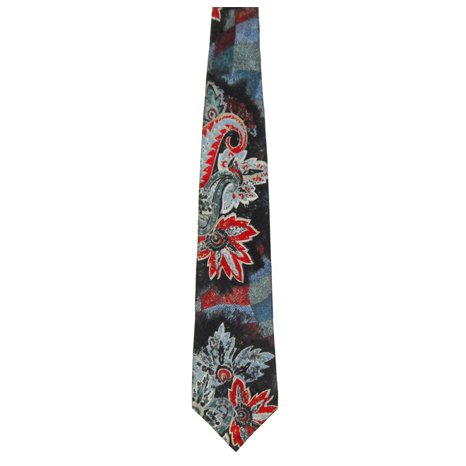 Silk tie with a floral abstract design in red and blues.