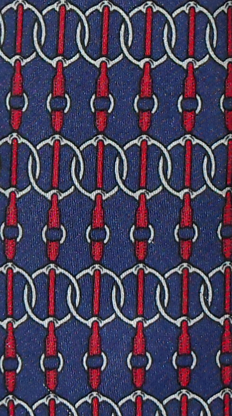 Hermes 597 silk tie with a an equestrian design of horse tackle on a blue background.
