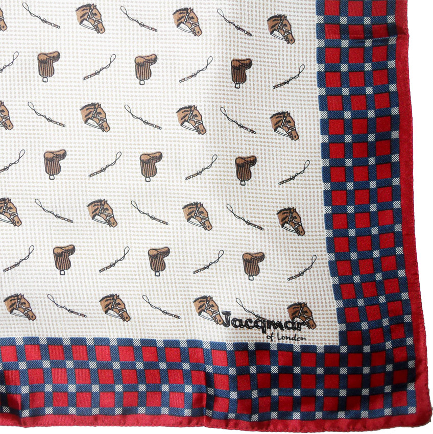 Small silk scarf by Jacqmar of London with an equestrian design and a chequered border in red white and blue. Measures 20″ (51cm) x 20″ (51cm).