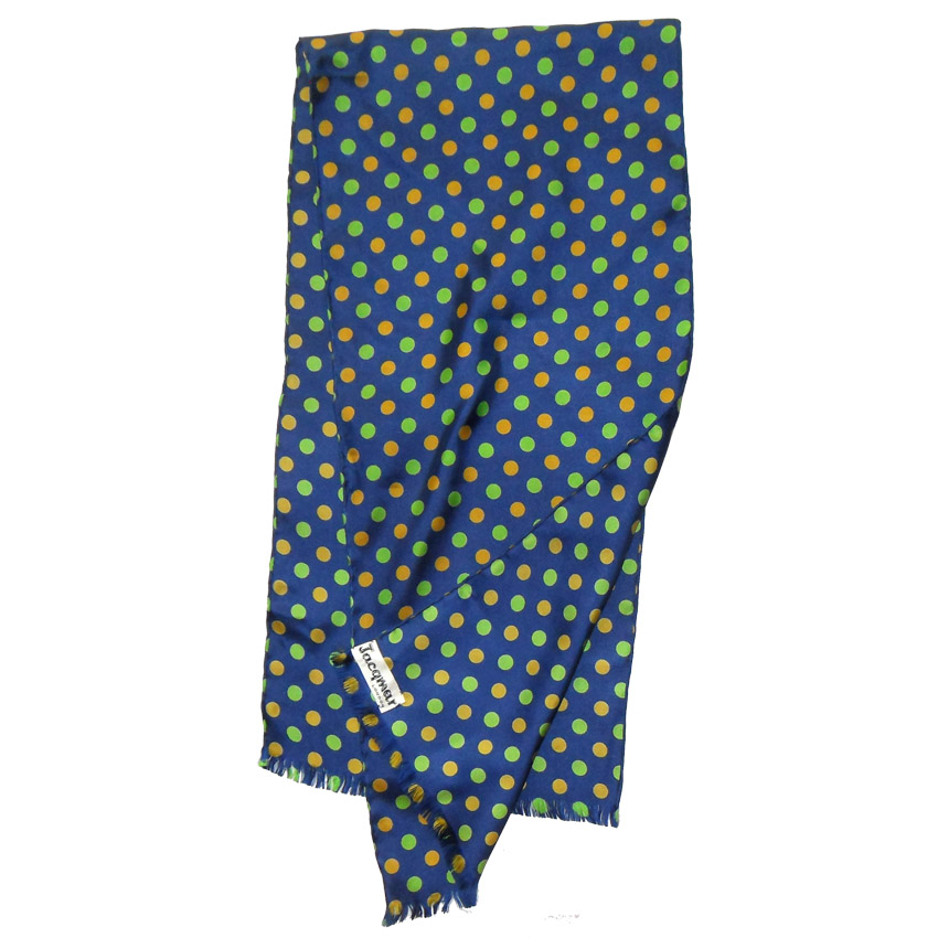 Jacqmar, England, long silk scarf with a blue background and a spot design in green and orange.  This scarf has hand rolled edges and measures 47″ (119cm) x 11″ (28cm).
