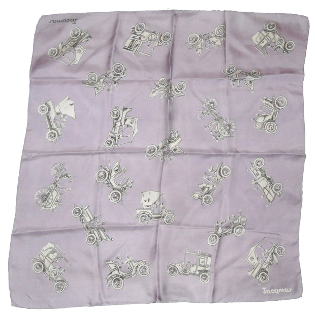 Jacqmar silk scarf with handrolled edges. This scarf has a pale lilac background and a design of vintage cars in black and white. Measures 29″ (74cm) x 29″ (74cm).