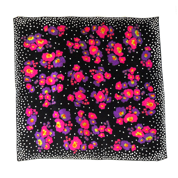 Vintage Jaeger silk scarf with a black background on textured silk and a vibrant floral design. Measures 33.5″ (85cm) x 33.5″ (85cm).