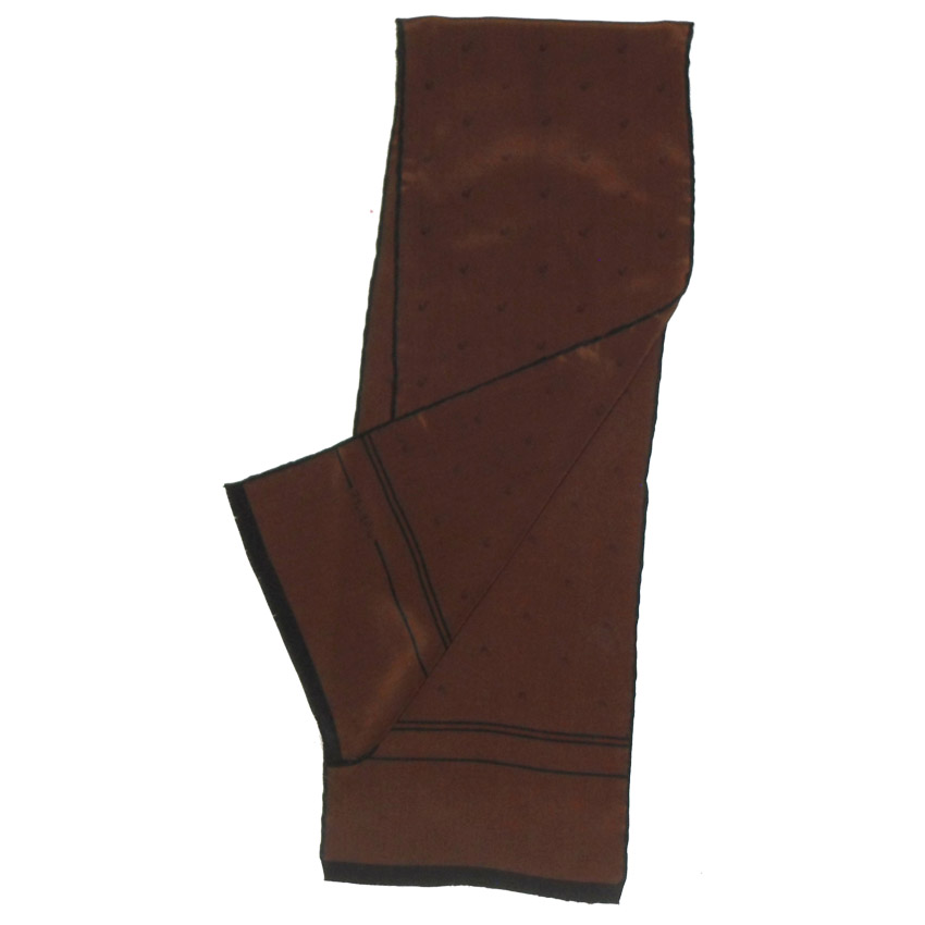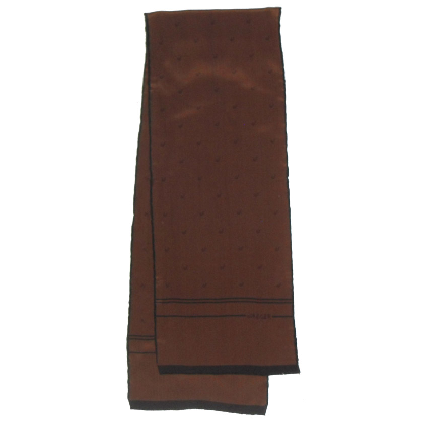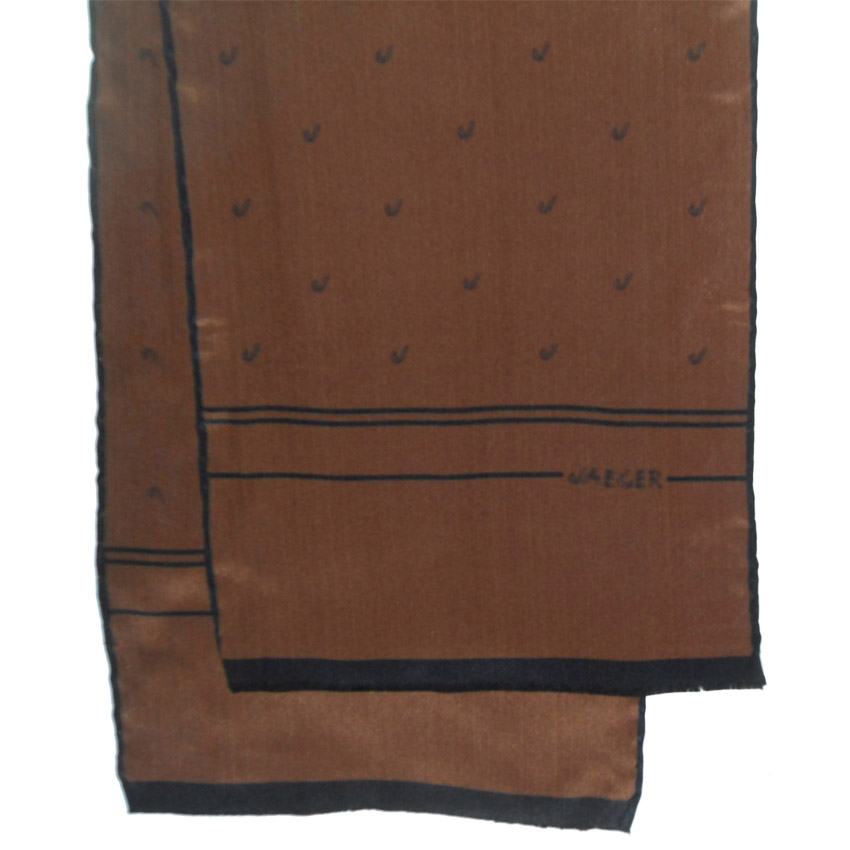 Long silk scarf with hand rolled edges, a dark brown background with a black edge and a small J design in black and the Jaeger name at one end. Measures 48.25″ (122cm) long x8.5″ (22cm).