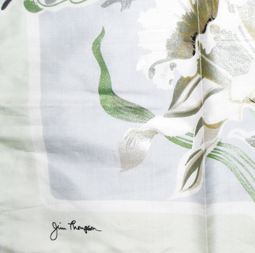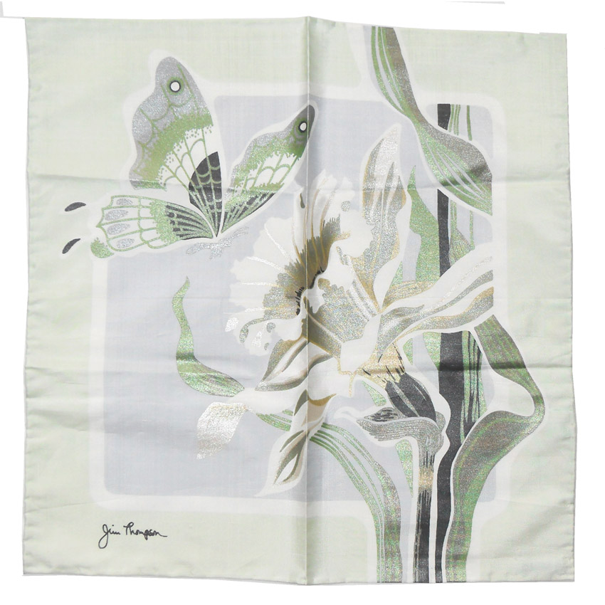 Jim Thompson pale green background silk pocket square with a design of a butterfly and foliage in shades of green, gold and silver. Measures 16″ (41cm) x 16″ (41cm).