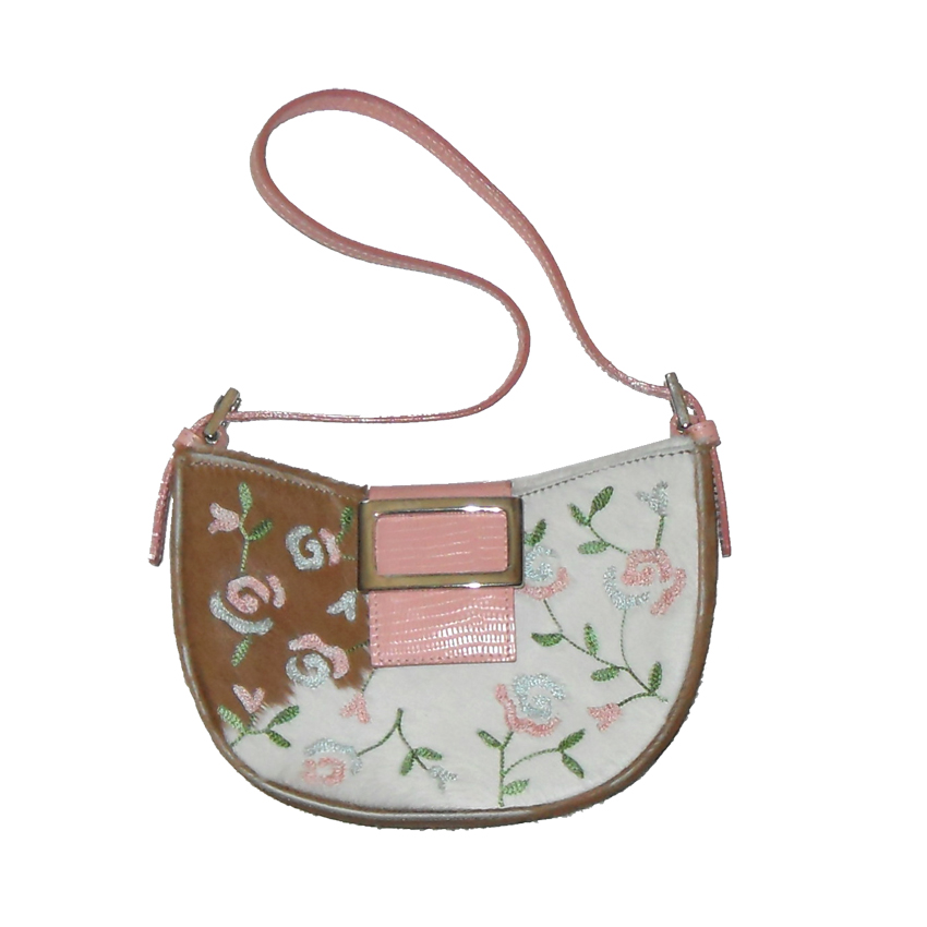 Kurt Geiger, made in Italy, small pony skin handbag with pink grained leather strap and closure with silver tone metal buckle. This bag has embroidered flowers on the front and is lined with black fabric. Measures 7.5″ (19cm) x 5″ (13cm) without handle.