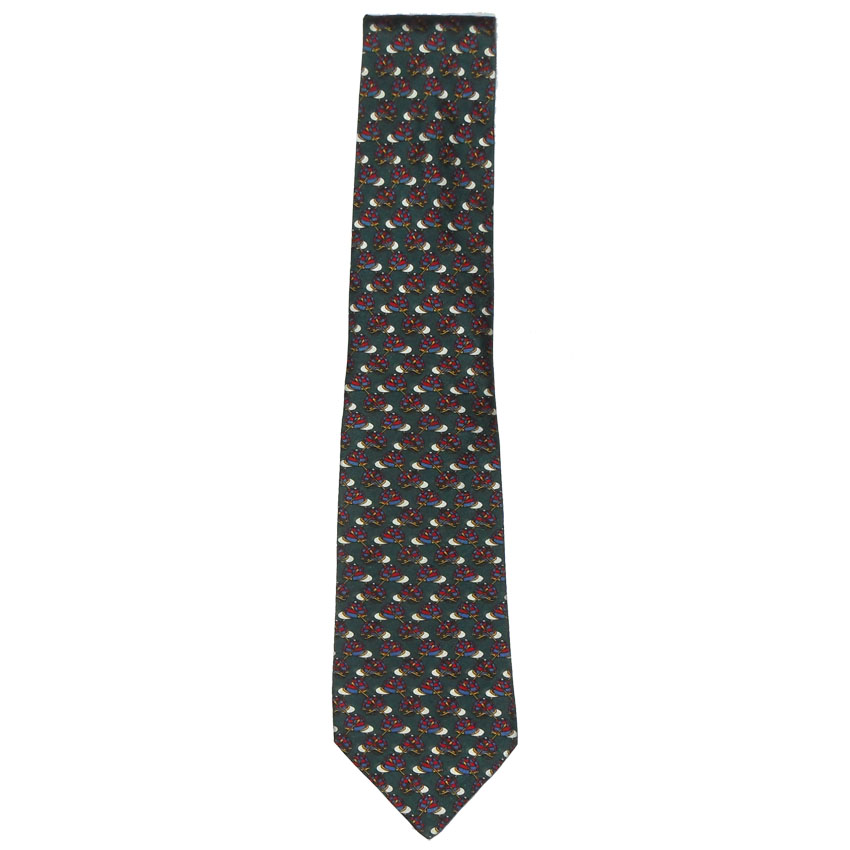 Lancel silk tie with a design of jockey’s caps in a red and blue check with a white peak and riding crops on a dark green background.
