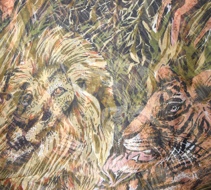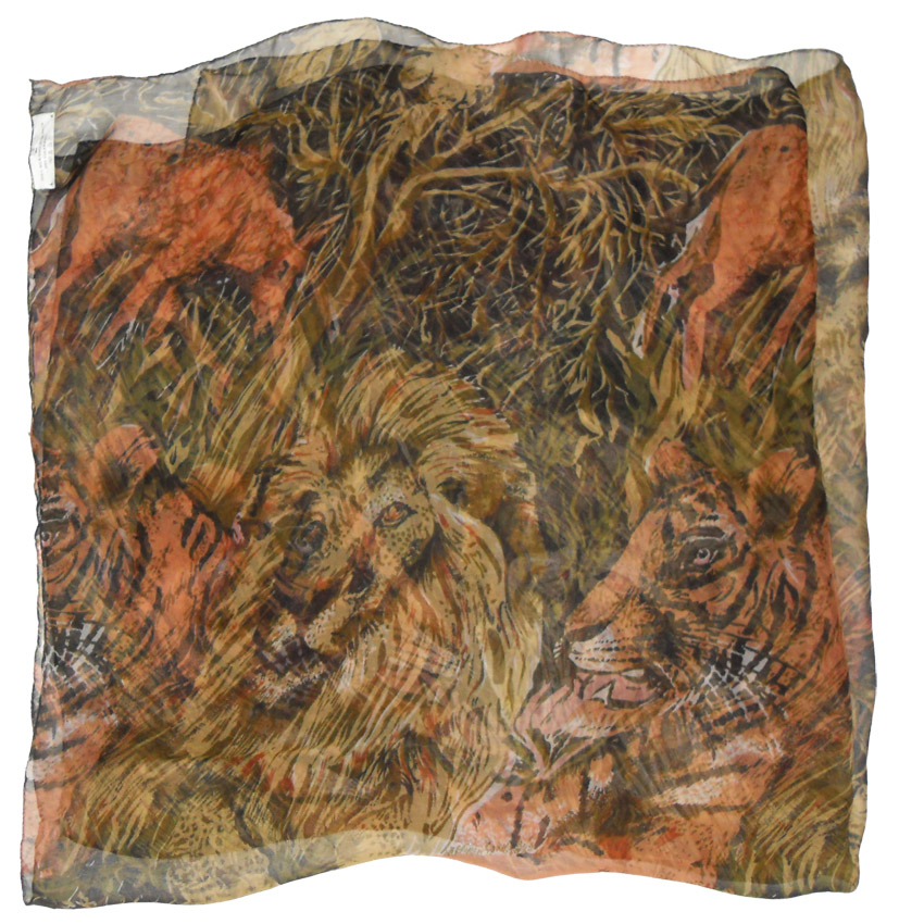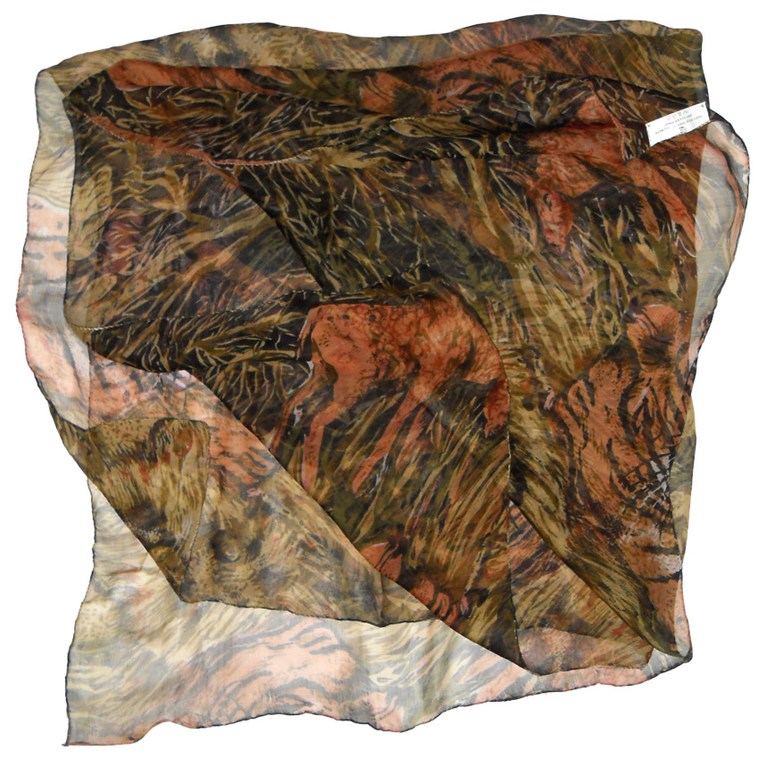 Large silk chiffon scarf with a design of jungle animals, lion, tiger and antelope. Measures 43″ (109cm) x 44″ (112cm).
