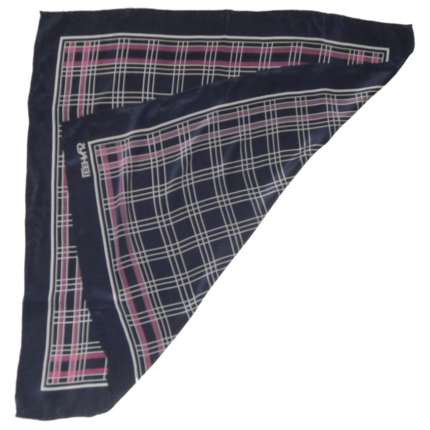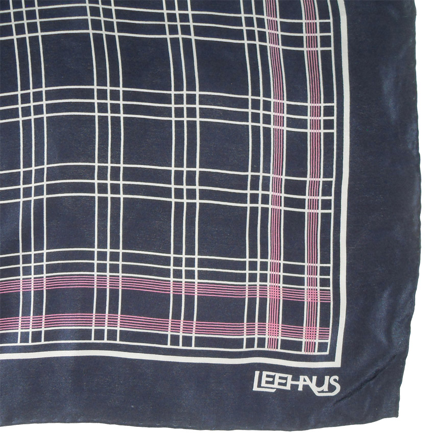 Vintage Leehaus hand rolled edge silk scarf with a dark blue background and grey and pink detail.  Measures 31″ (79cm) x 29.5″ (75cm).