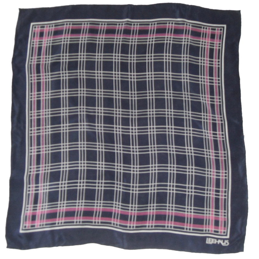 Vintage Leehaus hand rolled edge silk scarf with a dark blue background and grey and pink detail.  Measures 31″ (79cm) x 29.5″ (75cm).