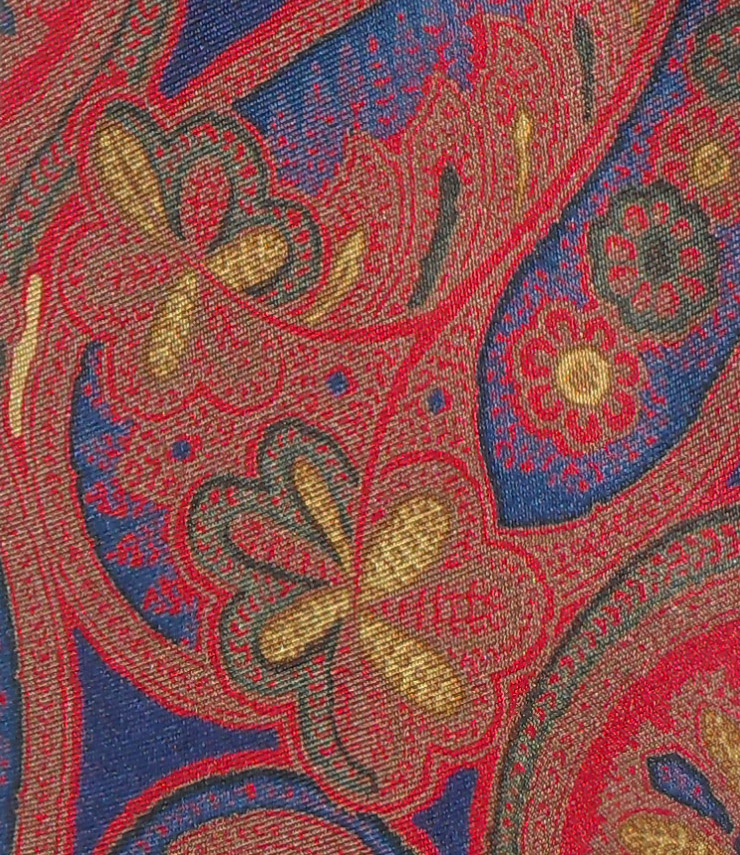 Liberty silk tie, made in England, with a large paisley design in brown, red, dark blue and yellow