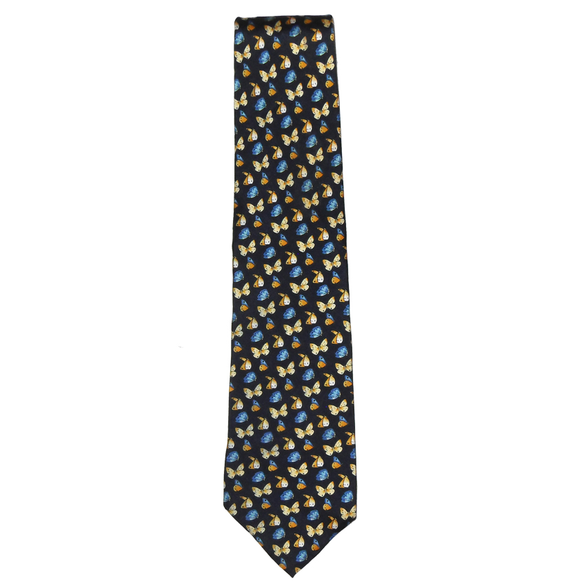 Liberty silk tie with a design of butterflies on a dark blue background.