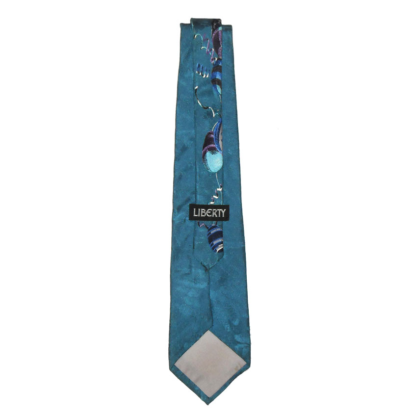 Vintage Liberty of London silk tie with a blue textured background and a design of balloons in blues, silver grey and purple.