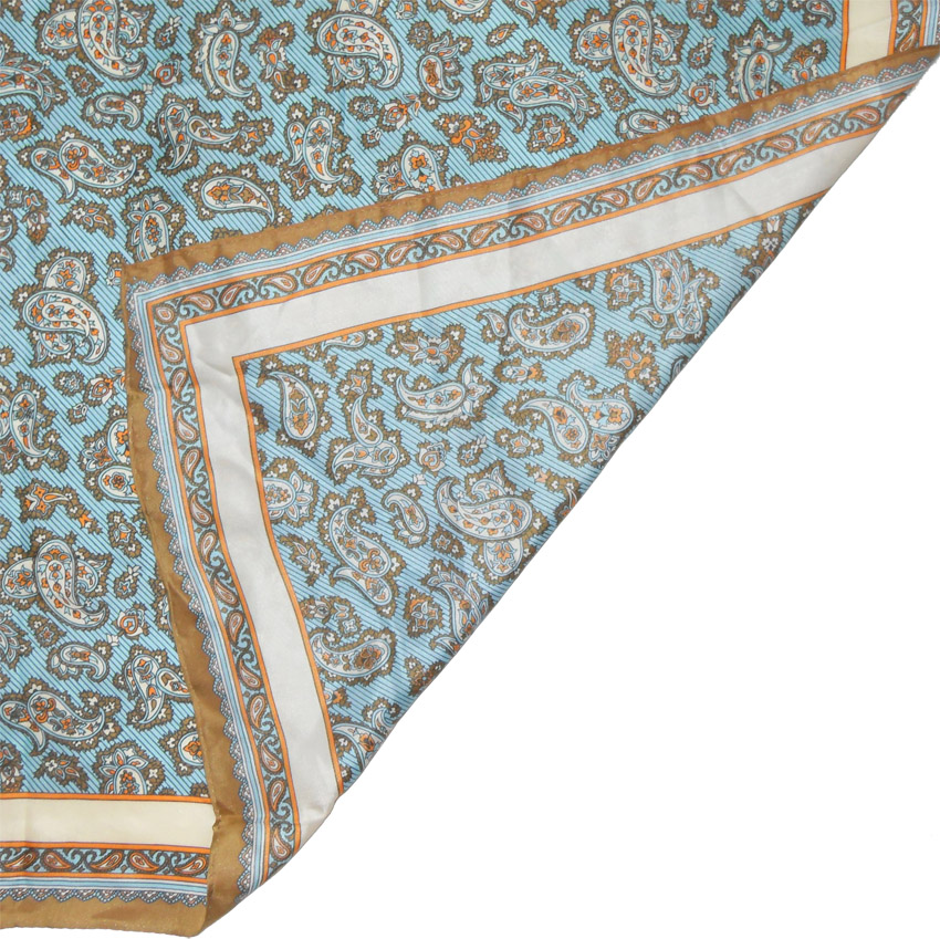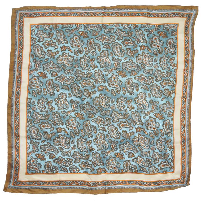 Silk square with a blue and brown paisley design and a brown and cream border. Measures 23″ (58cm) x 23″ (58cm). There is some thinning of the silk on the border.