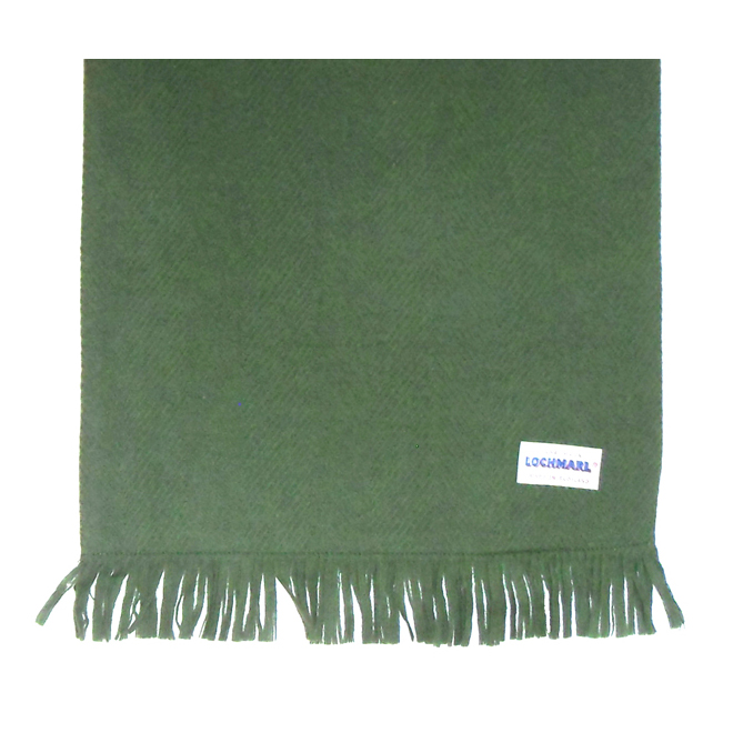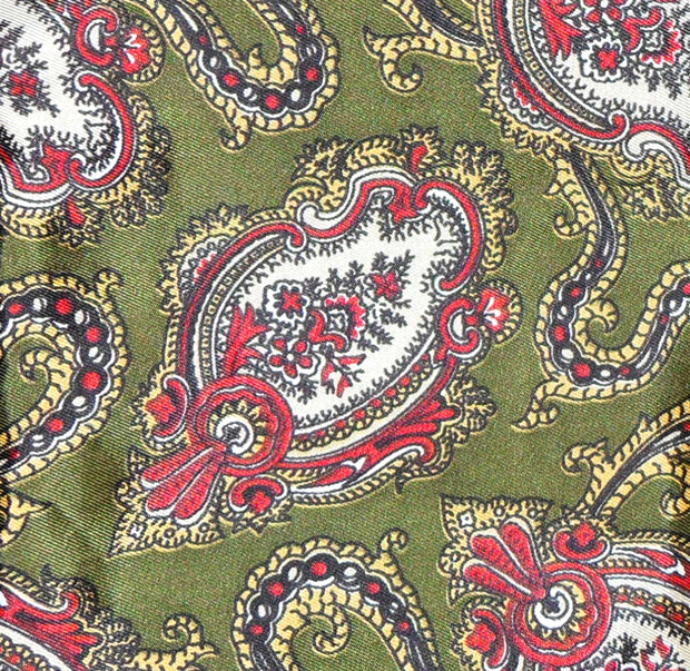 This scarf has a green rayon background with a red, cream, yellow and dark blue design on one side and is plain green pure wool on the other side.