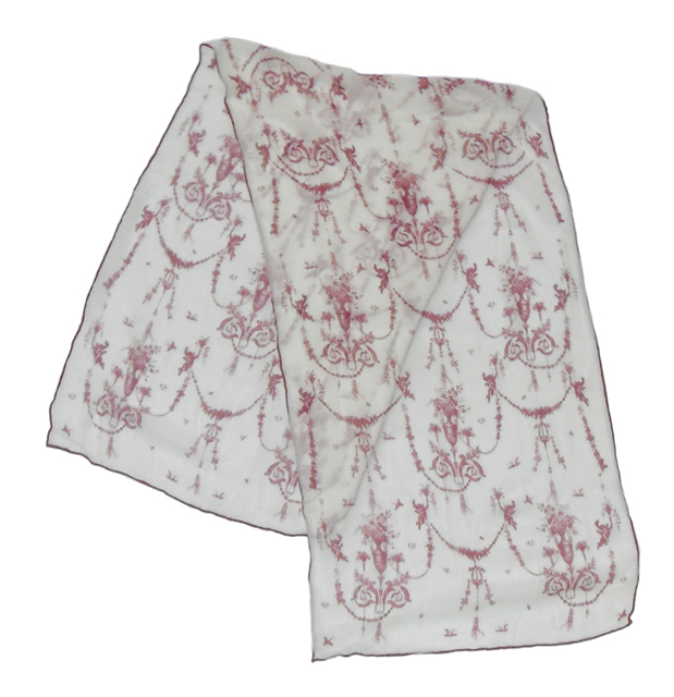 Long hand rolled edge silk chiffon scarf with a cream background and purple border and design of cherubs and urns with flowers. Measures 60″ (152cm) x 18″ (46cm).